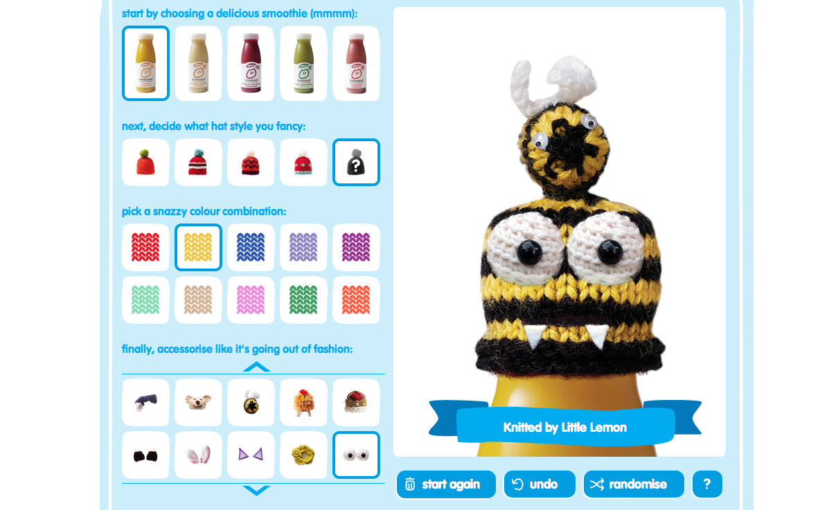 Every year, the elderly in the UK struggle through winter, but they’ve found a way to help! They are trying to get everyone (as in us) to knit a hat, lots of them, for their smoothie bottles. A million of them will hit the shelves in November and every time you buy one, 25p will go to Age UK and directly help those elderly people in need! How do you get involved? Either knit a hat or if your knitting isn’t quite up to speed (I don’t even know how to hold the needles!) then click on The Big Knit and you can generate your own virtual hat! Every time you share it on Facbeook or Twitter, an extra 10p goes towards Age UK. Give it a go! This is my virtual creation: