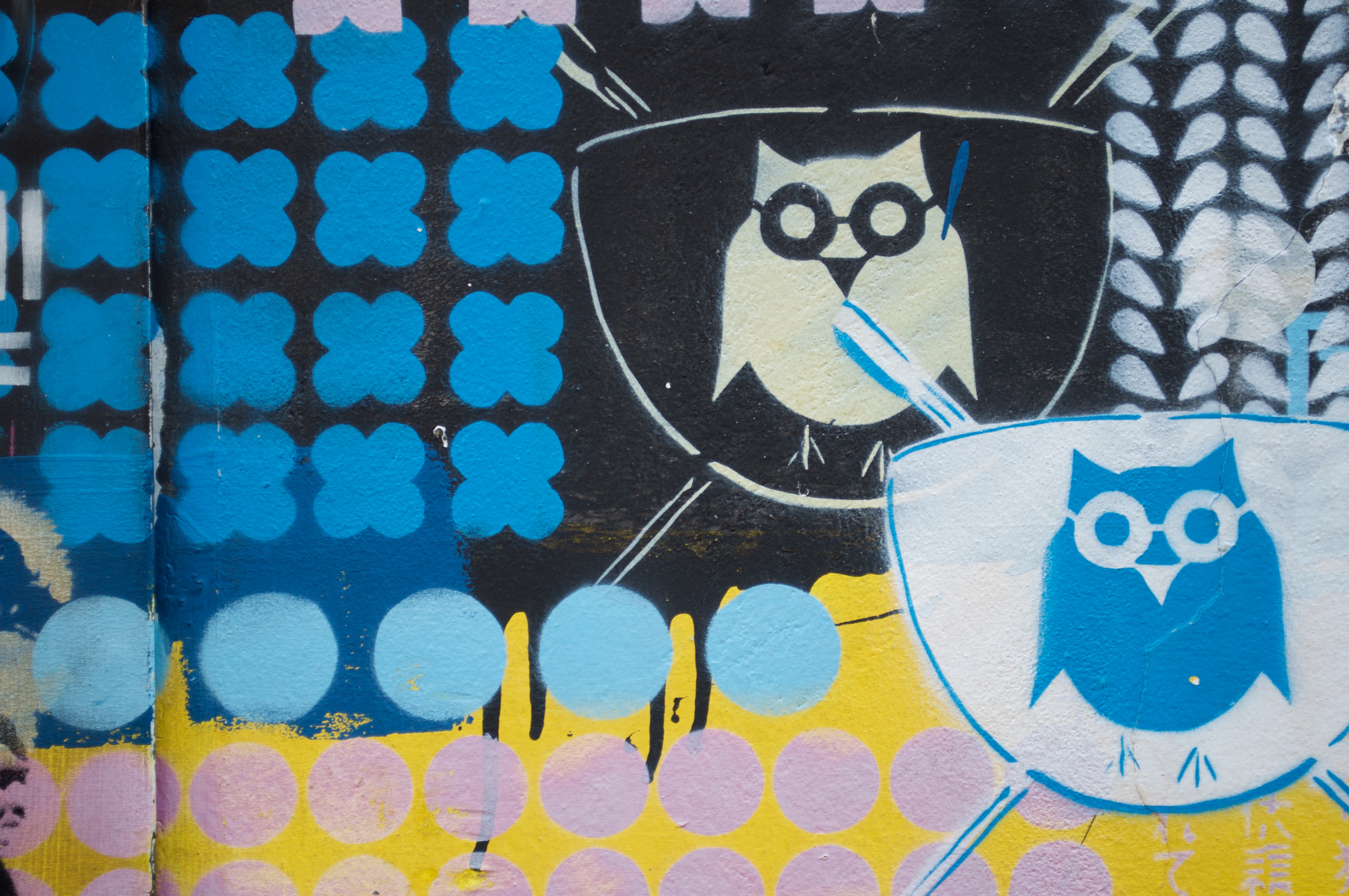 The last artist I’m going to cover is Cabaio. He is a commercial street artist. Compared to the others we’ve discussed, he is a different kettle of fish so to speak. Let me explain. Many shops, studios and offices do not want tags covering their walls so, they ask street artists to paint them. Cabaio has a stand out, vibrant style and normally works in layers. First layer is for colour background, second for texture and pattern, third for stand alone pieces on top of the composition. The perfect example, of this is at Fukuro, a ramen noodle bar (if you happen to pop by, I recommend eating their too). He used imagery from China, Korea and Japan (I believe) to create a wacky shop front for this fusion restaurant. The inside is just as awesome. When it comes to commissioning street artists, money isn’t always the way. Often shops will supply them with the materials they need or the artists expect something from the shop (ie food, clothes etc). Fair trade in my books!