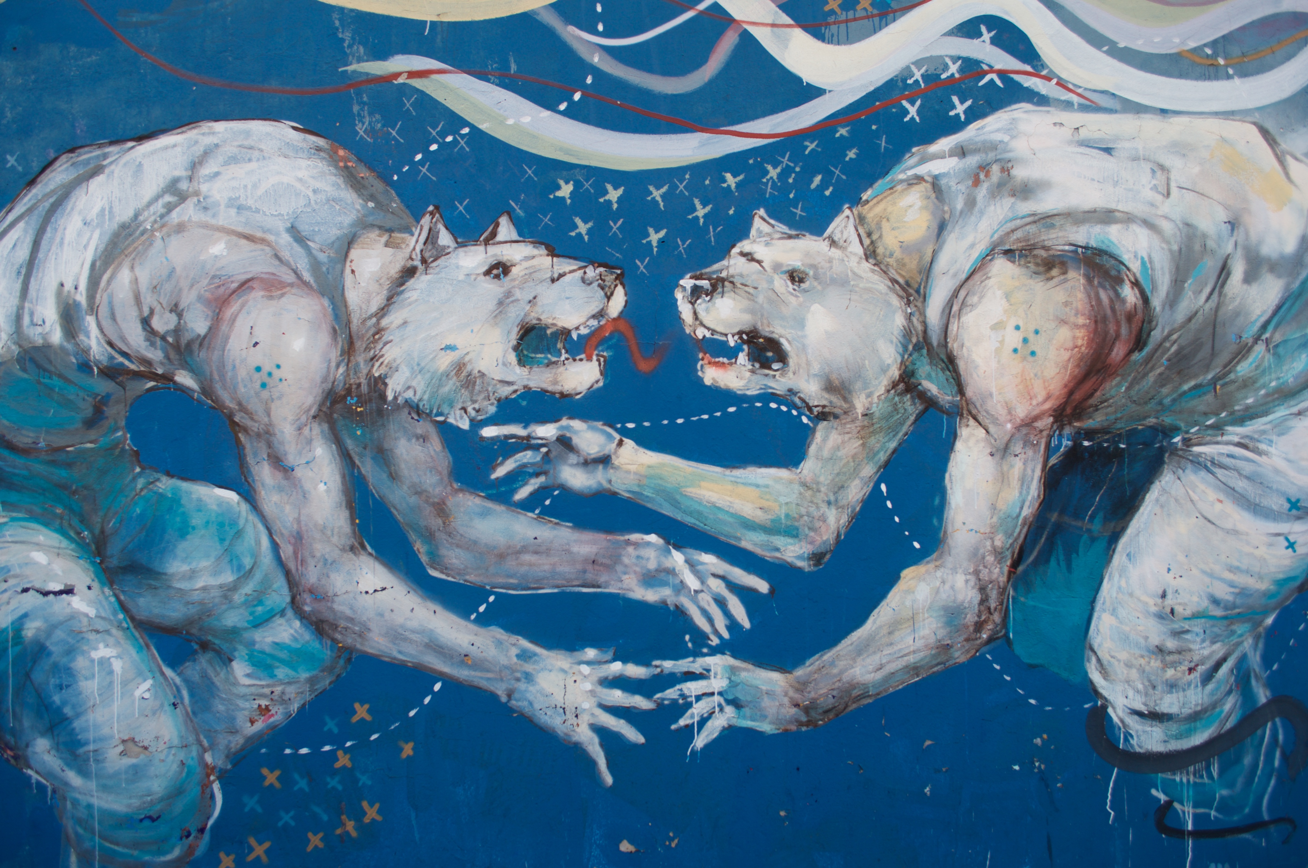 Jaz, my favourite artist we saw on the tour, covers very modern themes where he symbolises the ‘urban tribes’ he is targeting with clothes, jewellery or tattoos, but then masks them with animal heads. More often than not, his characters are vicious and violent portraying duality and reference to both local and pop culture. On this wall, he is focussing on the football hooligans which, apparently, are almost an equivalent to the mafia in Buenos Aires. The wife beater vests and tattoos is what gives their identity away.